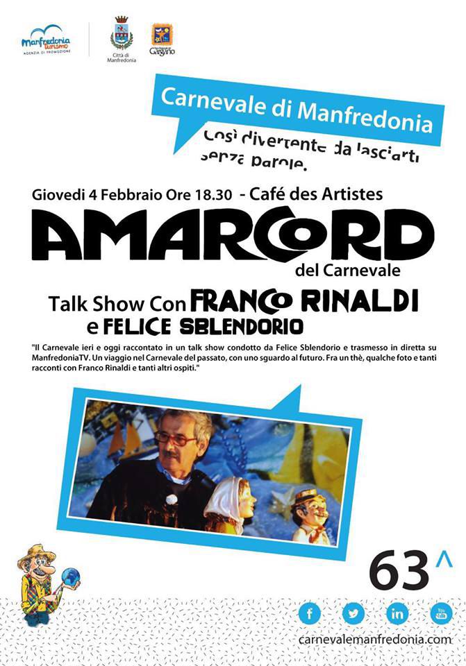 Dagli ospiti famosi alle socie, dai gruppi alla tradizione della cartapesta sipontina, dall’irriverenza del periodo alla trasgressione, per arrivare all’aspetto culinario, musicale e ludico della manifestazione: “Amarcord Carnevale” farà rivivere gli anni storici e gloriosi del Carnevale di Manfredonia, ancora spontaneo e distante dalla grande macchina organizzativa degli ultimi anni. L’evento sarà trasmesso da Manfredonia TV (Canale 93 del Digitale Terrestre). Intanto si registrano due interessanti notizie: stretta una partnership con Tiscali, che garantirà anche una diretta nazionale della gran parata del 7 febbraio, e conferimento alla città del premio “Innovazione sociale” per la costituzione dell'ecomuseo