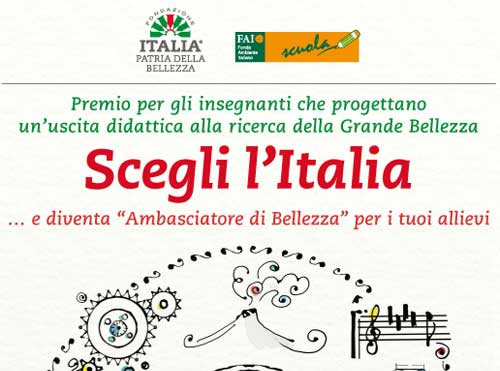 Clicca per Ingrandire Prosegue con successo l’iniziativa “Scegli l’Italia”, premio speciale per i docenti delle scuole italiane promosso da Fondazione Italia Patria della Bellezza e Fai-Fondo Ambientale Italiano per l’anno scolastico 2015-16. Il progetto, che ha già raggiunto la soglia dei cento iscritti, vuole coinvolgere gli insegnanti nell’organizzazione di uscite didattiche formative come strumento di conoscenza e comprensione dei molteplici aspetti della bellezza italiana, nonché occasione per il coinvolgimento degli studenti in un percorso di acquisizione di competenze socio-culturali e di cittadinanza.