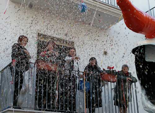 “L’operazione - prosegue - veniva ripetuta per le strade del paese, accompagnata da urla, frastuono e risate degli astanti. All’imbrunire, l’asino col suo carico e tutto il seguito si dirigevano (e si dirigono tuttora) verso il Castello, dove il fantoccio di Carnevale veniva gettato in mare dalla Rupe antistante. I ‘Carnevali’ appesi nei vicoli, invece, venivano bruciati. Le alte fiamme illuminavano la notte, segnando l’avvento della Quaresima”. Ed è esattamente quanto successo al tramonto di ieri: la processione in maschera - il ‘funerale’ - si è portata alla Rupe del Castello e il lancio di “Carnual” ha chiuso ufficialmente l’edizione 2016.