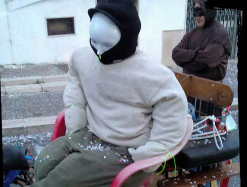 “Si prepara un fantoccio - spiega - nella cui pancia si mette di tutto, lo si carica su un asino al cui seguito c’è un chirurgo, accompagnato da un corteo di gente mascherata, fra cui: madre, moglie, figli e parenti di ‘Carnual’. Il dottore taglia la pancia del pupazzo e ne estrae vari oggetti, fra cui un pezzo di salsiccia: solo alla fine estrae il gigantesco ‘maccherone’ (oggi rappresentato da un lungo tubo di plastica) che ha provocato l’indigestione di ‘Carnual’. Nel carnevale antico, durante l’operazione, la gente che si ammassava intorno cantava lo stornello ‘U pedë ‘u porkë (Il piede del porco).
