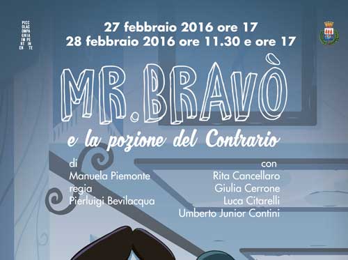 “Mr. Bravò e la pozione del contrario” sarà la prima puntata di un nuovo format a teatro. Chi è Mr Bravò? Cosa sogna? Di sicuro con lui anche un ordinario pomeriggio di compiti può trasformarsi in una grande avventura. Lo spettacolo è scritto da Manuela Piemonte. In scena Rita Cancellaro, Giulia Cerrone, Luca Citarelli e Umberto J. Contini. Regia di Pierluigi Bevilacqua. Spettacolo consigliato per un pubblico dai 5 anni in su.