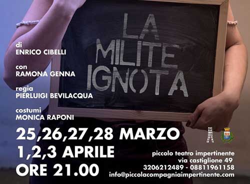 Lo spettacolo, scritto da Enrico Cibelli e interpretato da Ramona Genna, è il monologo doloroso e onirico di una donna a caccia di conferme. Su se stessa e il proprio talento. Dove, naturalmente, ogni riferimento a fatti o persone è puramente casuale. Eppure lo spettacolo muove da un fatto di cronaca realmente accaduto: Firenze, estate 2008, una violenza di gruppo ai danni di una ragazza, poco più che ventenne. “La Milite Ignota - puntualizza Bevilacqua - è una pièce a metà fra cronaca e melodramma.