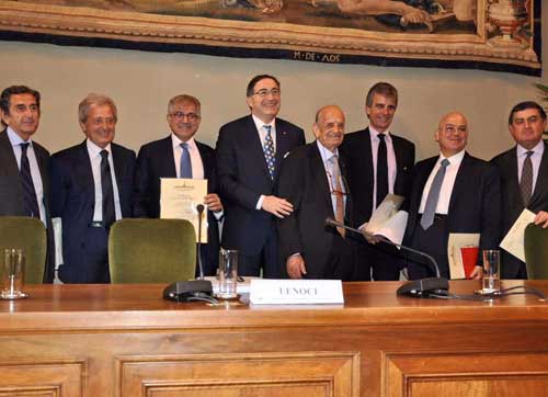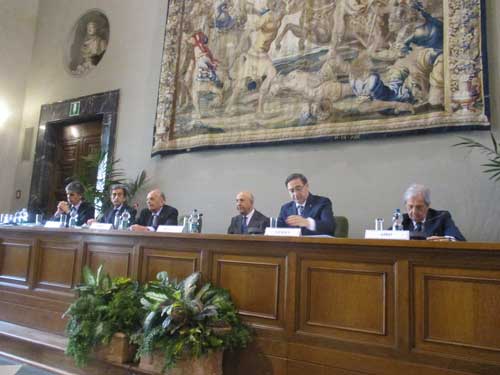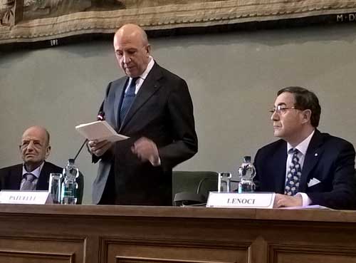 Clicca per Ingrandire È stata come sempre Roma a ospitare il 13 aprile la cerimonia di assegnazione del Premio “Donato Menichella” (leggi Scheda in calce; ndr) per gli studi socio-economici. La manifestazione, promossa dalla Fondazione Nuove Proposte Culturali si è svolta in questa 15.ma edizione nella sede che con maggior frequenza ha ospitato il Premio: la meravigliosa Sala della Clemenza di Palazzo Altieri. Ha aperto i lavori Antonio Patuelli (foto 2 sotto; ndr), presidente Abi, che ha delineato l’opera di Donato Menichella facendo interessanti collegamenti con l’attuale momento di messa in sicurezza del sistema bancario italiano.