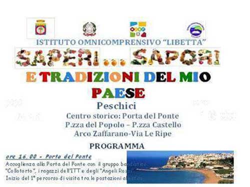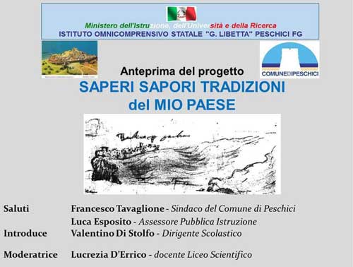 Mercoledì 20, Atrio Scuola Primaria, ore 10: anteprima del progetto “Saperi Sapori Tradizioni del mio paese” (foto 2), a cura dell’Istituto Omnicomprensivo - Interverranno: il sindaco e l’assessore P.I. Luca Esposito, il dirigente scolastico, Lina Biscotti che relazionerà su “La funzione dei racconti nell’infanzia peschiciana”, Angelo Piemontese con “U Cuntë dë l’Orchë”, Paolo Labombarda che ripresenterà la sua “Ġrammàtëka Pëskëciànë”, gli alunni delle terze A e B di Scuola Primaria coordinati dalle insegnanti Vita De Nittis e Lucia Martino con la scenetta “Lite alla fontana”, gli alunni di 4ª B Scuola Primaria coordinati dall’insegnante Imelda Palazzo e la collaborazione del gruppo folk “i Rascillë” in un canto popolare, gli allievi dell’Itt coordinati dalla docente Veria Iacaruso con la scenetta “Dialogo tra comari” e del Liceo Scientifico coordinati dal docente Angelo Piemontese in un canto popolare. Modererà Lucrezia D’Errico, docente del Liceo.