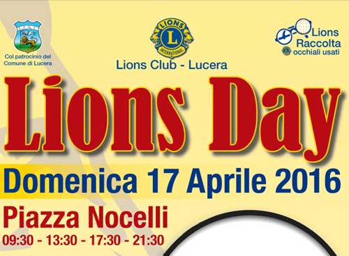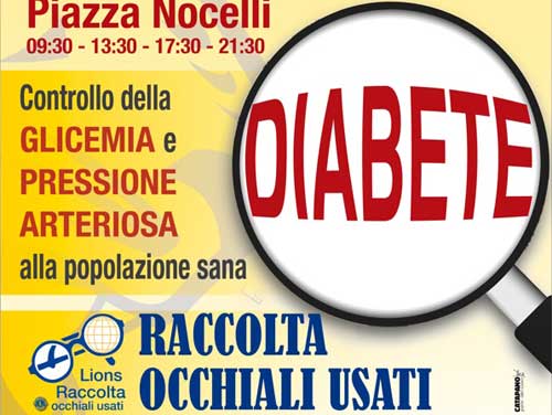 A Lucera, col patrocinio del Comune di Lucera, è prevista una manifestazione lungo tutto l’arco della giornata del 17 aprile durante la quale sarà organizzata un’azione di controllo della glicemia e della pressione arteriosa nella popolazione sana. Una postazione Lions sarà presente dalle 9,30 alle 13 e dalle 17,30 alle 20 in Piazza Nocelli a disposizione della popolazione. Chiunque potrà farsi controllare gratuitamente pressione arteriosa e glicemia da parte del personale medico e paramedico presente, coordinati dal dottor Giuseppe Lembo. A ognuno verrà consegnato un cartoncino col risultato degli esami ed eventuali consigli medici.