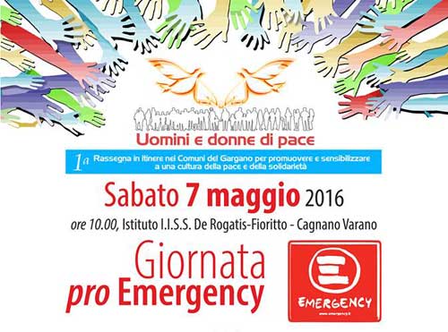 Un impegno umanitario possibile grazie al contributo di migliaia di volontari e sostenitori, che dalla sua nascita a oggi, hanno curato oltre sette milioni di persone. Così il 7 maggio 2016, l’Istituto “E. De Rogatis-Fioritto” di Cagnano Varano ospiterà l’Associazione Emergency di Gino Strada per incontrare studenti e studentesse del Gargano nella “Giornata pro Emergency” e illustrare il lavoro svolto nei tanti teatri di guerra presenti nel mondo. Saranno presenti Sergio Colavita per “Emergency”, Iolanda Carbonelli per “Schiamazzi”, il dirigente scolastico dell’Istituto “E. De Rogatis-Fioritto” di Cagnano Varano Francesco Donataccio, il sindaco di Cagnano Varano Claudio Costanzucci e Nicolino Sciscio ideatore della rassegna.