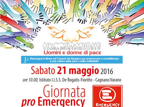 21 MAGGIO = L’Istituto “E. De Rogatis-Fioritto” di Cagnano Varano ospiterà l’Associazione ‘Emergency’ di Gino Strada, che incontrerà studenti e studentesse del Gargano nella “Giornata pro-Emergency”, per illustrare il lavoro svolto nei tanti teatri di guerra presenti nel mondo. Nella rassegna non poteva mancare un incontro interamente dedicato a questa associazione promotrice della cultura della pace, della solidarietà e del rispetto dei diritti umani.