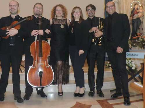 Clicca per Ingrandire Parte da un Maestro di musica di origine viestana, Andrea Vescera, tromba solista, e il suo “Ensemble Dauno” (foto 1 sotto; ndr - violino Mario Ieffa, violoncello Daniele Miatto, pianoforte Mario Longo, soprano Gina Palmieri) l’idea di uno spettacolo esclusivo e unico nel suo genere per ricordare le vittime del terremoto del Centro Italia. Lo spettacolo dal titolo “Per ricordare e... ricostruire” girerà tutta l’Italia. L’8 dicembre si svolgerà alle 19 nella Chiesa Madre San Nicola di Mira a Rodi Garganico su richiesta del parroco don Michele Pio Cardone che ha inserito tale spettacolo nel calendario delle festività natalizie (leggi cartellone in coda all’articolo; ndr).