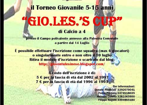 Le partite verranno disputate nel campetto annesso alla palestra comunale di Lesina a partire dalle ore 18 di martedì 15 Luglio fino al 25 agosto, per un totale di 72 partite. Sul blog dell’associazione (http://gioventulesinese.blogspot.com) è possibile trovare tutte le notizie, calendari, formazioni delle squadre e foto delle attività dei ragazzi della “Gioventù Lesinese”. L’associazione si propone di operare in ambito giovanile mettendo in opera un progetto a medio-lungo termine che prevede l’esercizio di attività sportive dilettantistiche, nonché l’attuazione di programmi annuali di formazione didattico-sportiva, finalizzati alla partecipazione delle squadre di calcio giovanili ai vari campionati FIGC previsti dal Settore Giovanile e Scolastico (S.G.S).