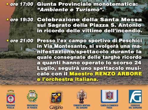 Ore 21.00 - Presso l’ex campo sportivo di Peschici in via Montesanto, si svolgerà una manifestazione/spettacolo durante la quale saranno consegnate targhe-ricordo a quanti hanno operato lo scorso 24 luglio. Seguirà uno spettacolo musicale con il Maestro Renzo Arbore e l’Orchestra Italiana.