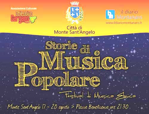 Clicca per Ingrandire Si alza il sipario della seconda edizione del festival di musica etnica. Ancora una volta Monte Sant'Angelo protagonista. La kermesse, organizzata da "il diario Montanaro" e dalla Città di Monte Sant'Angelo si terrà in Piazza Beneficenza, dal 17 al 20 agosto a partire dalle 21.30. A inaugurare il festival (domenica 17 agosto ore 21.30) saranno i Sud Folk, che coinvolgeranno il pubblico con un viaggio attraverso le musiche dell'Italia meridionale, dalla tammurriata napoletana alla tarantella garganica, dalla pizzica salentina alla tarantella calabrese, fino ad arrivare in Sicilia, con contaminazioni reggae.